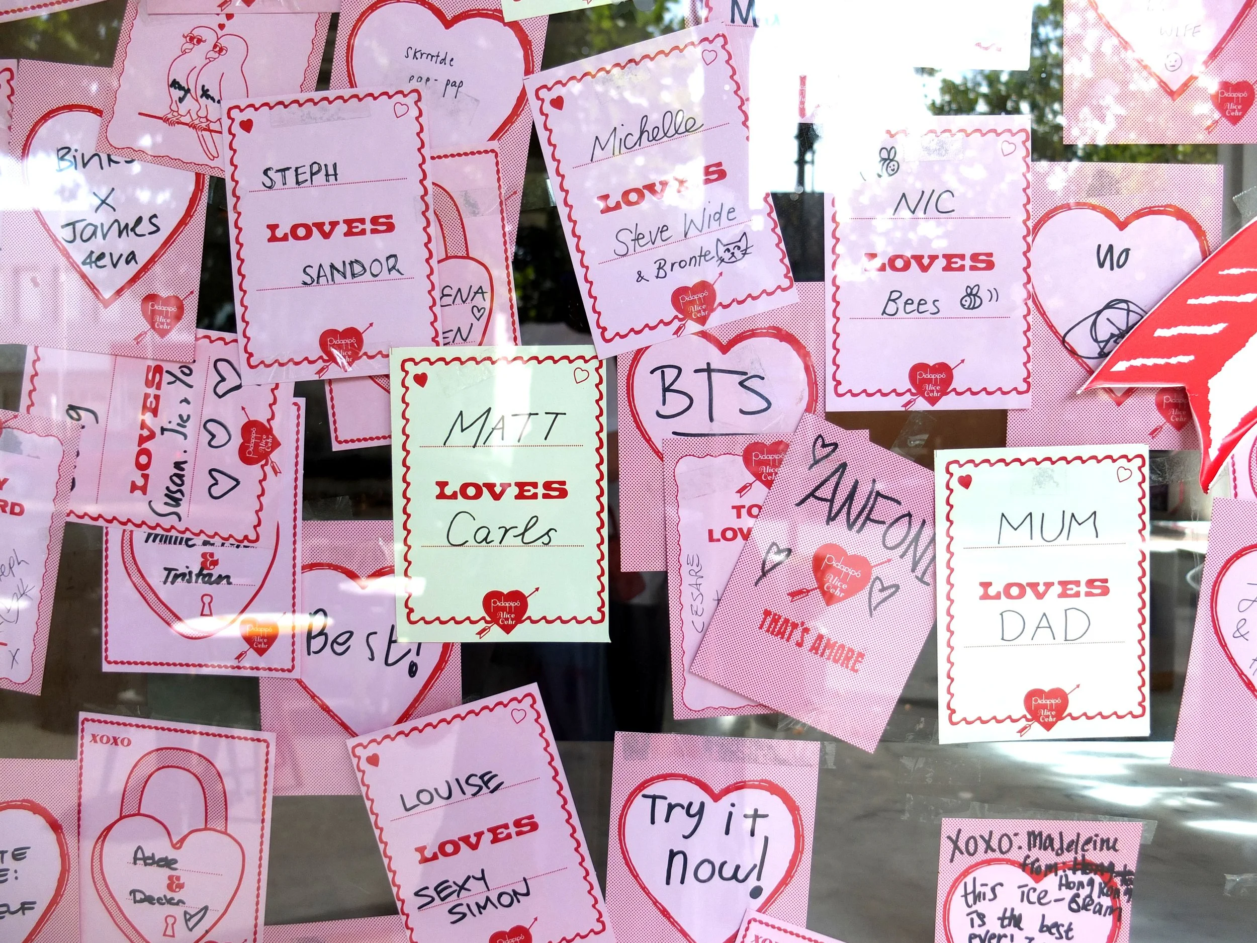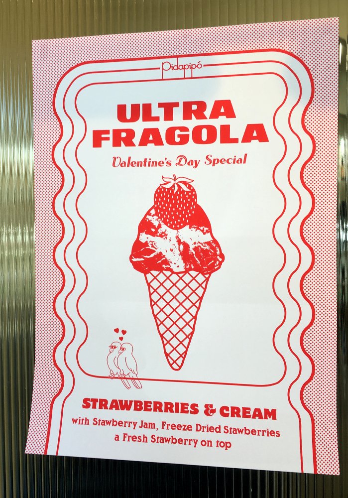 For Valentines day, I was commissioned to create personalised love notes to go out with every gelato sold in store at Pidapipó Gelateria, and with those delivered via Uber Eats. I created a love wall in each store, where people could post their love dedications in the window for all to see. I worked with Lisa Valmorbida to design a custom gelato flavour called ULTRAFRAGOLA, after Ettore Sottsass’ famous mirror. It was delicious and there were good vibes all round.